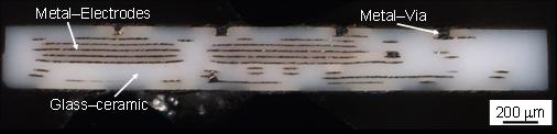 Low Temperature Co-fired Ceramics (LTCCs) are 3D micro-network of metal structures embedded within a glass-ceramic substrate, also known as Ceramic Printed Circuit Boards (see Fig. 1). They are used as high precision electronic devices (e.g. mobile and automotive technologies). The co-sintering of ceramic substrates with metallic conducting paths (Leiterbahnen) at low temperatures (i.e. 900 °C) enables the use of Ag and Cu as electrode material (see Fig. 2). In relation to typical polymer circuit boards (e.g. PCB), LTCCs are thermo-mechanically more stable (i.e. higher E-modulus, lower Thermal Expansion Coefficient) and can withstand higher acceleration forces (up to ca. 60g). The can be utilized in high temperature environments (until 180 °C), which facilitates the use of LTCC in systems that are to be both thermal- and mechanically loaded.