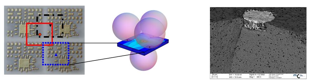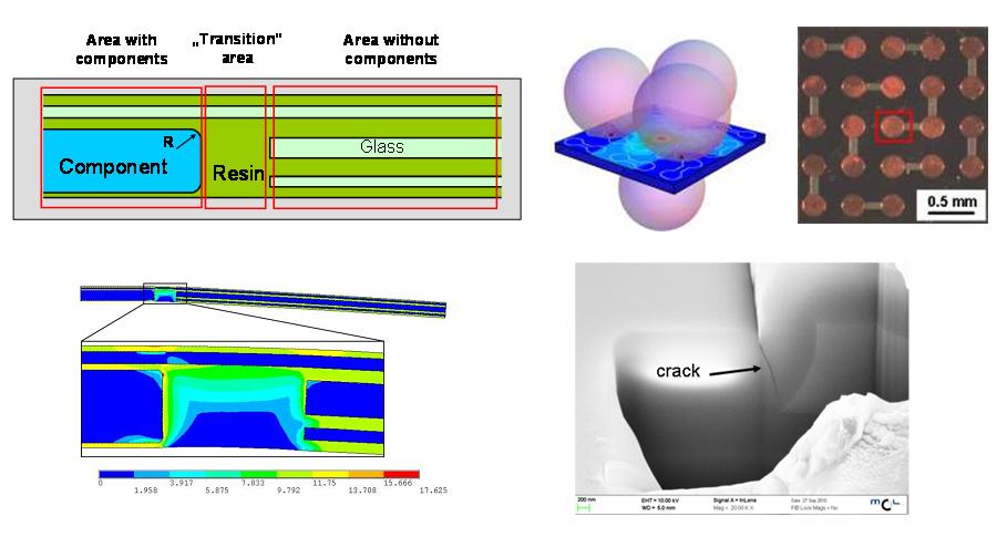©MUL/ISFK Figure 2. Left: FE model and simulation results of stress and deformation of the PCB with embedded components. Right: Testing methodology to determine the biaxial strength of brittle embedding components with special features (contacts). The onset of damage (crack) after mechanical loading is visible through FIB analysis.