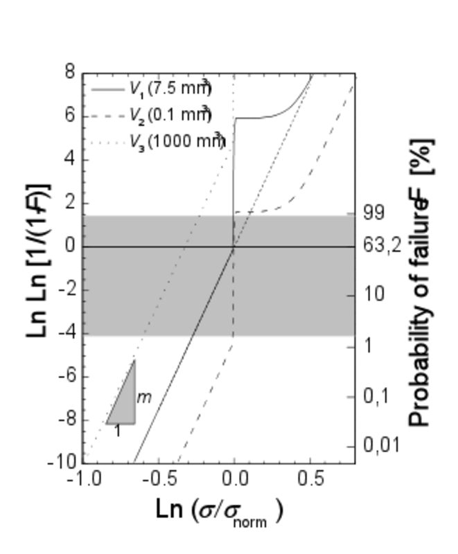 Keramiken enthalten eine Vielzahl kleiner herstellungsbedingter „Defekte“, das sind Werkstoffinhomogenitäten, die zu einer lokalen Konzentration der Spannung führen. Diese „Defekte“ können als Risse beschrieben werden. Das Versagen von Keramiken geht in der Regel von so einem (dem bruchauslösenden) Defekt aus. Große Defekte verursachen geringe Festigkeitswerte. Das Griffith/Irwinsche Versagenskriterium sagt voraus, dass die Festigkeit mit dem Kehrwert der Quadratwurzel der Defektgröße skaliert. Da in geometrisch gleichen Proben die größten (bruchauslösenden) Defekte unterschiedlich groß sind, ist auch die Festigkeit der Proben verschieden: die Festigkeit weist eine große inhärente Streuung auf, die mit einer Verteilungsfunktion beschrieben werden kann.
