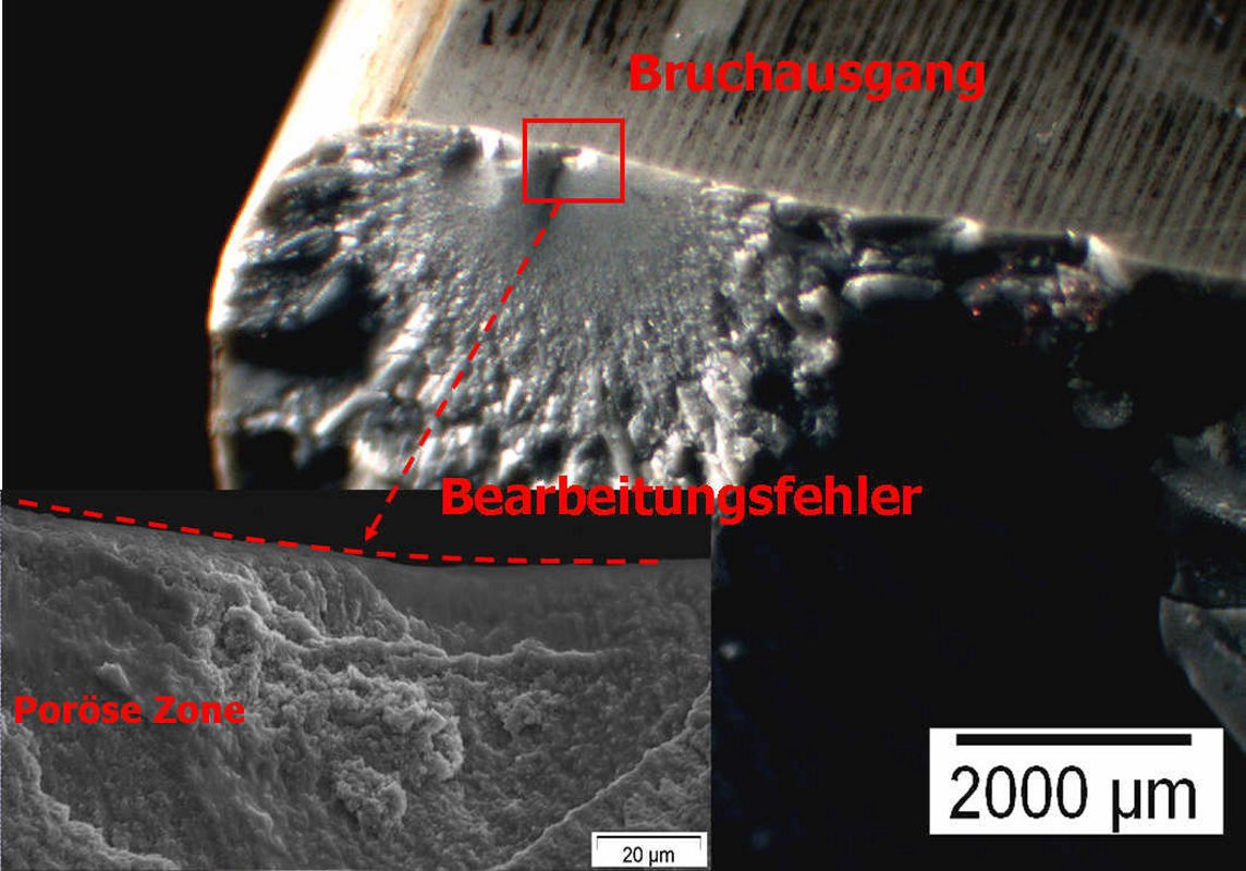 Bei Oberflächendefekten handelt es sich hauptsächlich um Fehler die von der Oberflächenbearbeitung (i.e. Schleifen) stammen oder aber durch unsachgemäßes Handhaben der Bauteile und Proben in die Oberfläche eingebracht werden. Um derartige Defekte zu identifizieren werden nach Festigkeitsversuchen in der Regel fraktographische Untersuchungen durchgeführt.