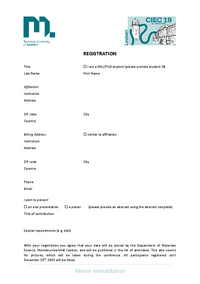 REGISTRATION Title I am a MSc/PhD-student (please provide student ID) Last Name First Name Affiliation Institution Address City ZIP code Country Billing Address similar to affiliation …
